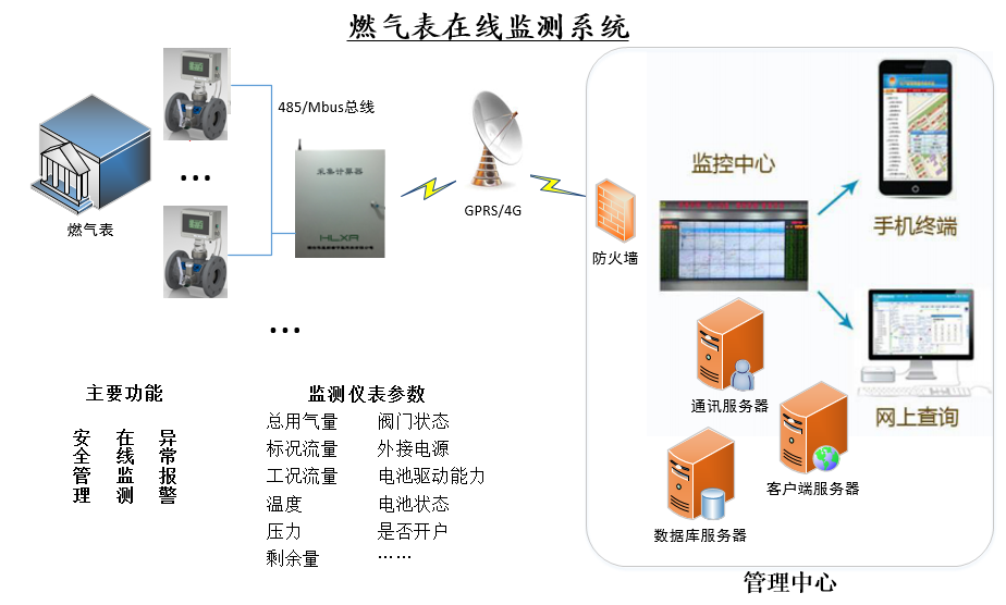 系統基于熱力公司網絡搭建能源站燃氣表集抄數據共享系統。所有大口徑燃氣表抄表廠家數據匯集到集抄系統上,與各相關系統(web客戶端、通訊服務器端、燃氣預交費系統、能源站控制系統等)共享數據庫資源,對天然氣大表的安全運營管理、異常報警、剩余氣量等參數在線監測,分析各能源站各時間段的用氣習慣,進行氣耗分析,為氣源輸配提供有效的數據支撐,進一步確保供氣安全,和更好的緩解高峰期流量不足的情況。